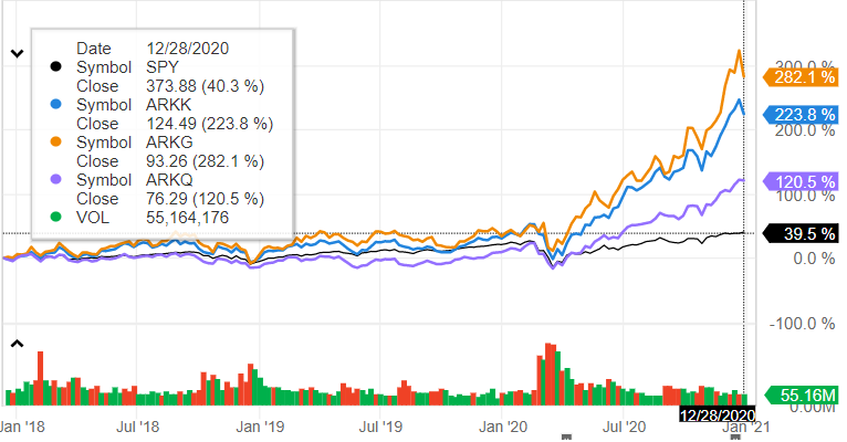 그 중 ARKK ARKG ARKQ를 S&500 지수추종 ETF인 SPY와 비교했을때 3년 동안 전반적으로 아웃퍼폼하는