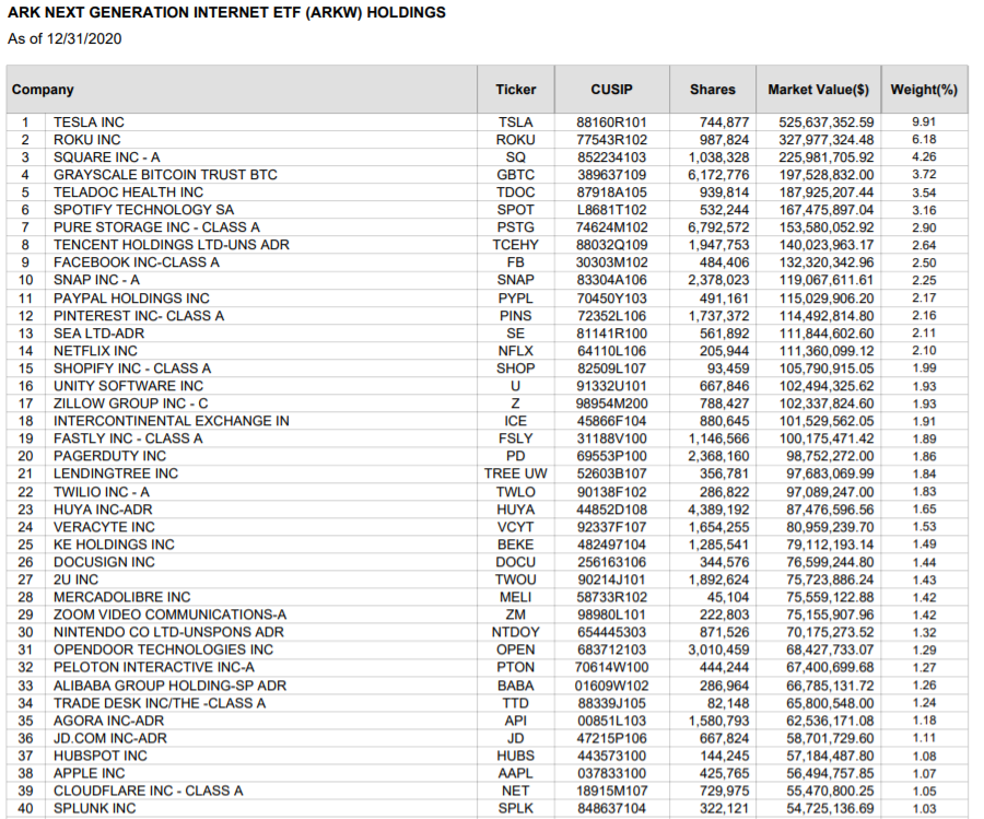 Next Generation Internet(ARKW) : 인터넷 부분을 중점으로 투자하는 ETF로 주로 인터넷으로 기반으로 비즈니스 모델을 가진 기업에 대해서 투자를 진행하고 있음