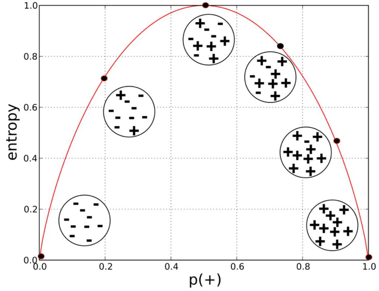(아래의 표를 보면 p(+)가 0이거나 1일때 엔트로피가 0인것을 볼수가 있다. 데이터 분석쪽에선 이게 잘 분류된 것)