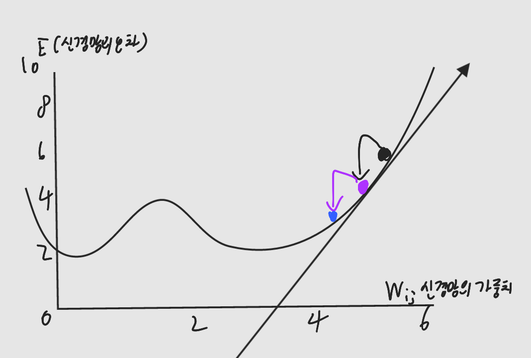 가중치 Wij의 값의 변화에 따라 오차 E값이 얼마나 변하는가?