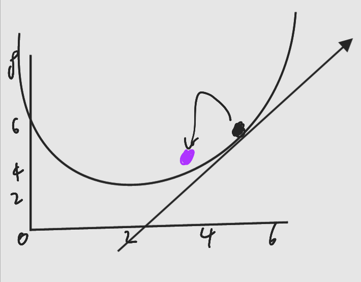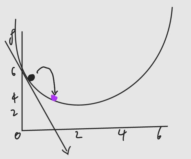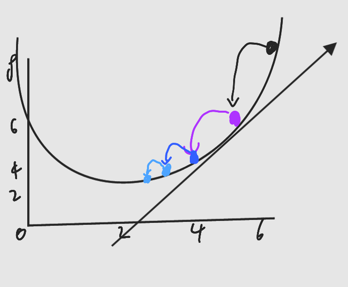 미분해서 기울기가 음수면 x를 오른쪽으로 움직이고, 양수면 x를 왼쪽으로 땡기면 가장 최저점을 찾을 수 있다.