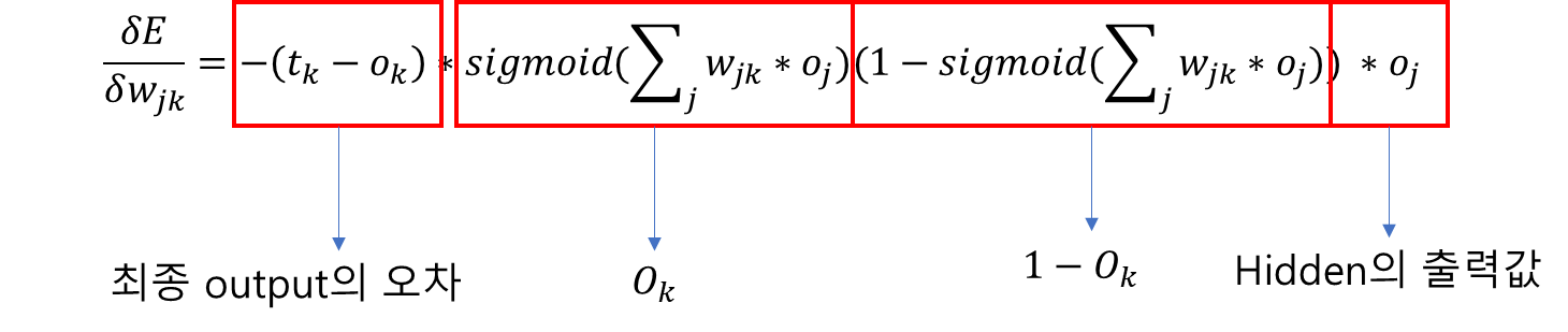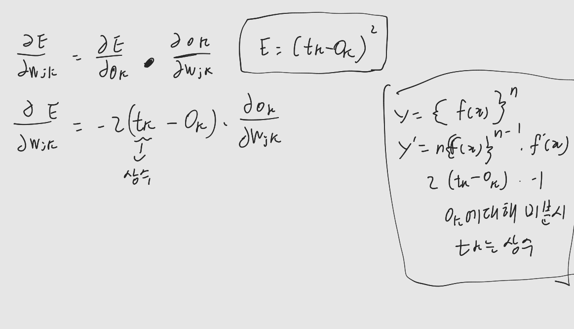 이전식에서 tk(목표값)은 상수이며, wjk값이 변하더라도 불변이다.