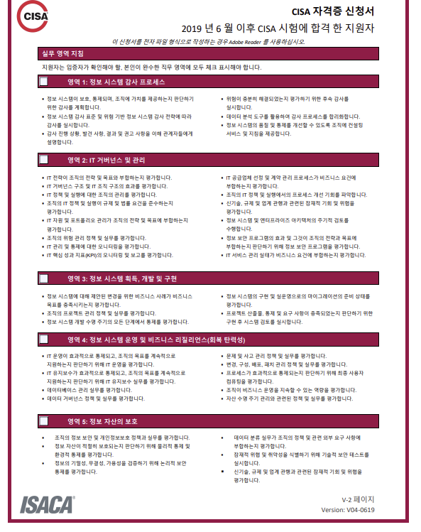 1page에서 CISA 실무 영역 분야에 체크한 부분과 동일하게 왼쪽에 체크박스에 체크하면 된다.