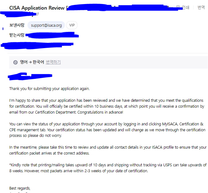 그러면 ISACA쪽에서 업로드한 서류를 검토하고 문제가 있으면 입력했던 이메일로