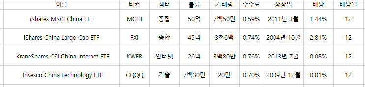 인덱스를 추종하는 MCHI, FXI가 볼륨이 제일 크며 거래량도 빵빵하다.