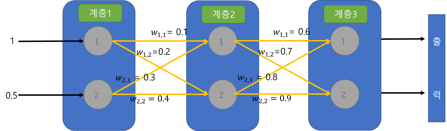 입력값으로 1과 0.5를 준다 그럼 계층1의 input은 정해지고 이제 계층2를 구해야한다.